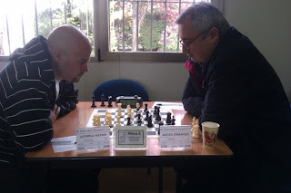 Ricardo y Roberto jugaron una inglesa que se desarrolló con igualdad hasta acabar en un final de siete peones por color y alfil blanco contra caballo negro. Consiguen coronar sendos peones sin embargo la dama negra junto con el caballo mas activo consiguen ventaja.
