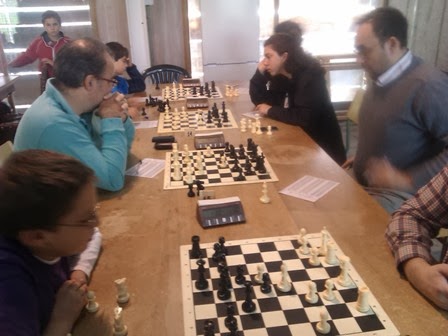 Laro y Luis en el tablero nº 7, se jugaron una Caro Khan en su línea Principal. En cuanto se salió el blanco de la teoría, igualdad total. Se van cambiando piezas y nadie cobra ventaja. Así se llegó al final, repartiendo el punto. Nada excitante digno de mención. Un buen resultado para el del Escorial.