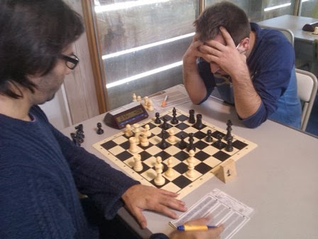 En la partida de Aitor contra David, el blanco emerge del Gambito escocés con un peón de mas, que ya no soltará. Un fallo posterior del negro, cede el punto completo. Inicio de la recuperación de un torneo corto de rondas.