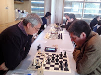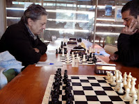 En el primer tablero Oliver se medía a Suso en una India de Rey variante de fianchetto, la partida se convirtió en un lucha de maniobras en que el blanco poco a poco situaba mejor sus piezas gracias al mayor espacio conseguido. Paradojicamente Oliver monta una batería ganadora en la gran diagonal negra que debía ser dominio del alfil del segundo jugador, pero que había desplazado para darle mas juego. Que envidía saber jugar este tipo de partidas tan cerradas y casi sin espacio.