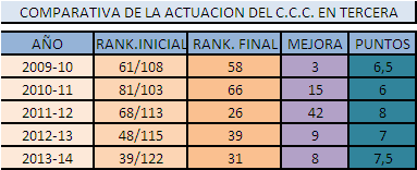 Por otro lado. no cabe duda que las temporada 2011-12 y 2013-14 han sido las mejores temporadas el equipo, sin embargo el medio punto a favor de la temporada 2011-12 no debe indicar necesariamente que esa temporada fue mejor que temporada 2013-14. La razón es que en la primera podríamos haber ido a media clasificación durante toda la temporada, y ganar las dos últimas partidas pegando un subidón, mientras que en la segunda podríamos haber estado luchando por el ascenso casi toda la liga y pegar un bajón en las dos/tres últimas jornadas.