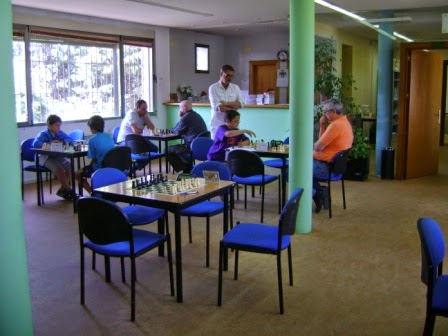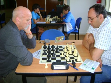 Jose Luis Martin y Roberto Fraga que también tardó en llegar, se enfrentaron en la mesa 3 con una Caro Khan variante del avance de por medio. Algo de tiempo ya perdió el veterano cuando en el movimiento 9 ya había movido el mismo caballo cuatro veces. El negro cogió una ventaja de 2 y pico que no soltó. El final también se alargó innecesariamente. Fraga decía al final que si ganar a un 1400 le había costado tanto esfuerzo ¡Qué sería el resto del torneo!