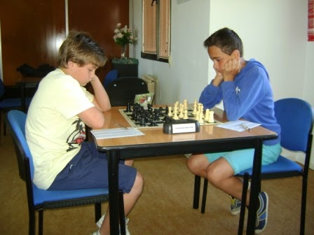 Finalmente en el último tablero se enfrentaron David Villacorta y Jorge García de Lorenzo. Italiana var. Giouco Piano (Juego lento) es lo que estaba sobre el tablero. Todo va bien hasta que la voracidad de De Lorenzo no se reprime y se come un peón del centro perdiendo pieza, en vez de cambiar Damas. Después otra pieza y esa ventaja es más que suficiente para un pollo con 1700 de Elo Fide y subiendo. Claro que el domingo que viene juega contra Suso y eso ya le va a costar bastante más.