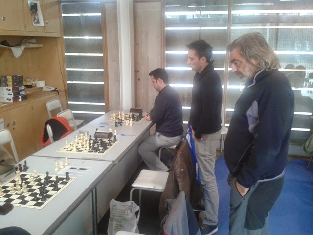 Luis Perea (al que ya no veremos más, en este torneo me refiero) y Francisco Peña se veían las caras en el sexto tablero. Una semieslava le planteó el negro. Todo iba bien mientras tuvieron cuidado. Francisco creyendo llevarse material se mete en una combinación larga, de esas que nunca terminas de ver todas las ramificaciones y eso fue su perdición (entiéndase perdición como pérdida del punto). Un jaque a intermedio con la Dama mandó al garete los planes de D. Francisco.