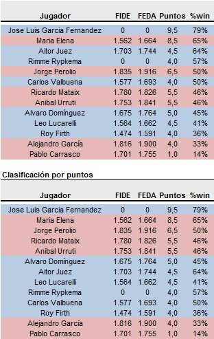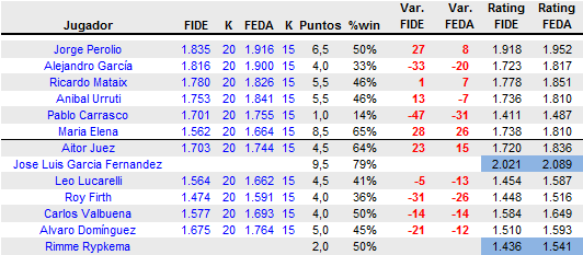 Algunas pérdidas de Elo van a ser sonadas y recordadas: Alejandro 30 pts, Alvaro 20 pts, Pablo 46 pts, Roy 28 pts. En la otra cara tenemos las subidas de José Luis, Rimme, Jorge o Aníbal con 16 puntos.